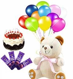 a birthday celebrationblack forest cake 4 * 165 g big cad bury 10 birthday latex balloon small teddy 8 inches..design may vary