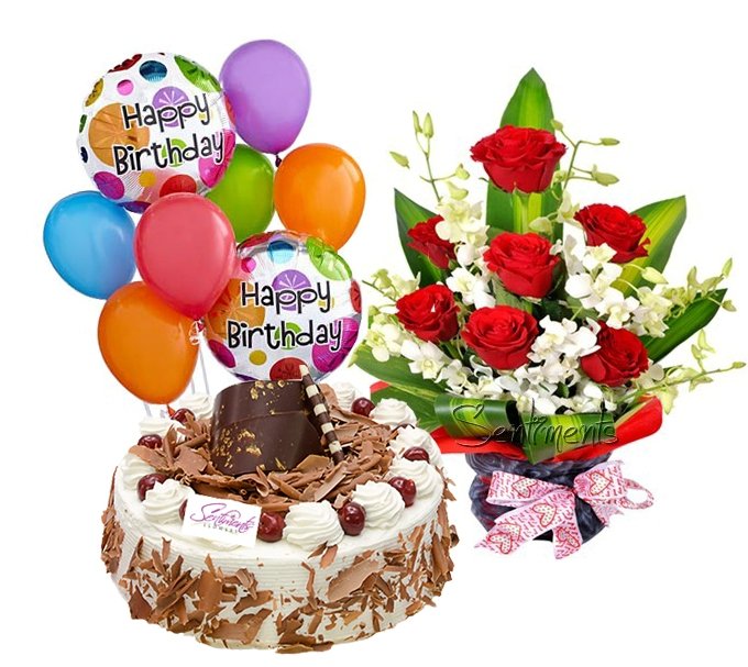 cake,flowers & balloonsBlack forest cake ,12 roses & 2 happy birthday & 6 ballons