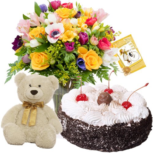 A Best Confer- Bounch Assorted Flowers + Teddy 8" + 1/2 Kg Black Forest Cake + Card