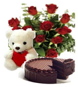 A Gift to youA beautiful way to let your spouse/ sweetheart/ loved one know how much she's missed. 12 Pieces red roses bouquet, 8 inches white teddy w/ iloveyou pillow and chocolate cake.Your gift will come with a greeting card