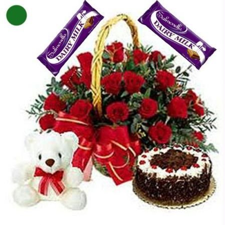 Eternal loveRED ROSES WITH CAKE CADBURY CHOCOLATES AND TEDDY BEAR.24 Exclusive Red Roses with round Cake , 2 * 65 g Cadburys Assorted Chocolates and a Cute 8" Teddy Bear.The gift is sure to fill the heart of the recipient with your thoughts. (We deliver only Freshly Baked Cakes.)