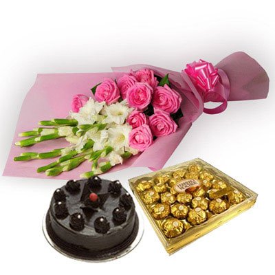 Precious MomentOne Sided bunch of 5 white Glads, 12 Pink Roses in Pink color paper packing with pink ribbon bow, 1kg chocolate truffle cake and box of Ferrero Rocher.