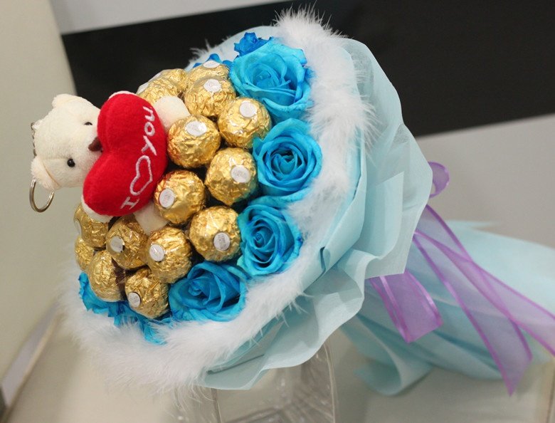 Blue Rose & Ferrero Rocher12 Blue rose with 16 Ferrero Rocher Chocolate & Heart Shape pillow and 9 inches teddy bear.