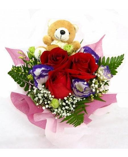 Mini table arrangementMini table arrangement - Mixed colour 12 roses arranged with a mini 8 " bear with fillers and greens in a decorative wrapping.