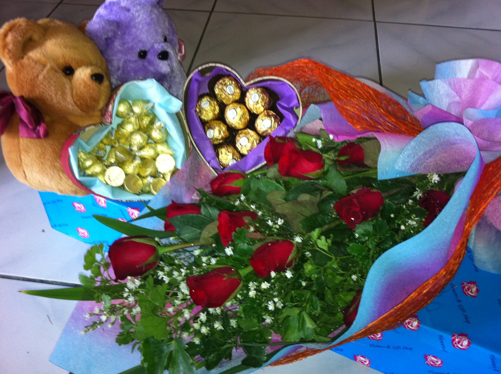 My Heart Is YoursDescription: Wish your near & dear ones a very happy b'day with this beautiful gift. 12 red rose bouquet,couple bear,heart shape ferrero chocolate & heart shape Hershey kisses.