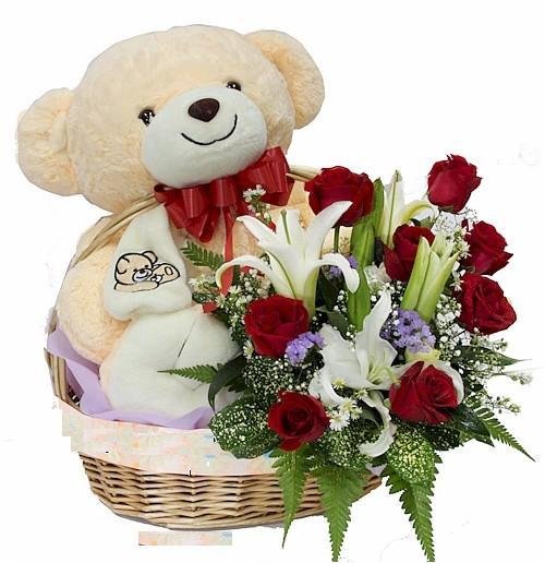 SWeet LOveSurprise her with this big cuddly light brown bear (24") come with red rose & white lily arrangement in a basket. Sure to bring a smile to anyone who loves bears.