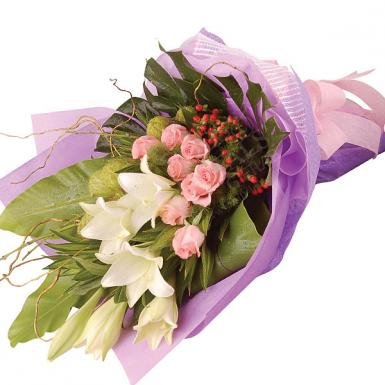 La VidaFlowers she will remember. Show her your appreciation with a grand floral bouquet of monstera leaves ,light pink or pastel pink roses, Berries and casa blanca lily.
