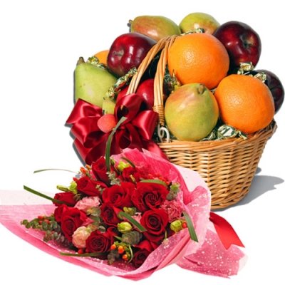 6 items Fresh Fruit Basket w/ 12 red rosessame like picN0TE: FRUITS ITEMS MAY VARY ..DEPEND ON TH AVAILABILITY