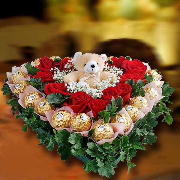 Forever LUV12 Red Roses & 24 Rochers With 8 inches Bear Love-Shape Table Arrangement