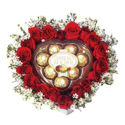 Mi AmorWho can go wrong with roses and chocolate? Why not combine them in this unique heart shaped arrangement of heart-shaped Ferrero Rocher 16 embedded in heart shaped 24 red roses.