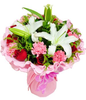 A Smile DayNine stems red roses with nine stems pink carnations and one white perfume lily mixed bouquet, send the deepest blessings to she, wish her have a good mood every day. Pink paper round style flowers.