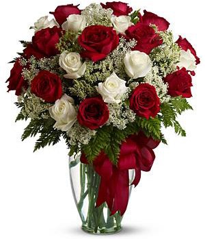 Lassie13 red roses, 8 white roses, match greenery and white flowers, arrange in a glass vase, red bowknot. (The picture is only for reference and the main items are the same and vase may vary for areas, the effect is guaranteed.)
