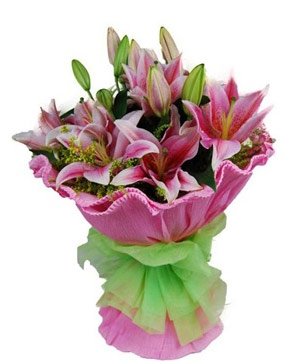 Lovesickness6 pink perfume lilies with solidago canadensis ornament. Pink color edge curl paper round package. Sour, sweet but lovesickness is a kind of happiness.