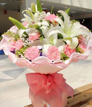 Pink Carnations with stargaizerPink Carnations, 3 white Lilies, full with gypsophila paniculata.