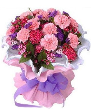 Pink Carnations20 pink carnations with forget met not and green leaves, white and pink paper beautiful packing.