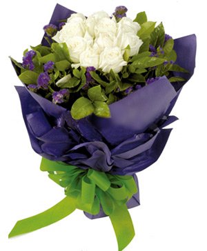 Purple Memory11 white roses match forget-me-not and green. wrapped by purple round paper with green bowknot. The intoxicating combination of our white roses with greenery gives you an extraordinary way to make a heartfelt statement to your favorite person.