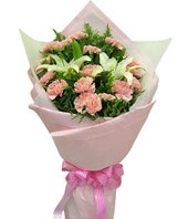 Spring BreezePink carnations 16, white(or pink) lilies 2, with green leaves fully.