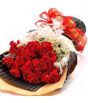 Thanks Mom18 red carnations with white flower and feathers, brown and orange paper fan-shaped pacakge. - The picture is only for reference and the main items are the same, the effect is guaranteed.