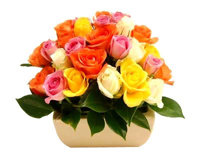 2 dozen multicolored2 dozen multicolored roses in a basket.